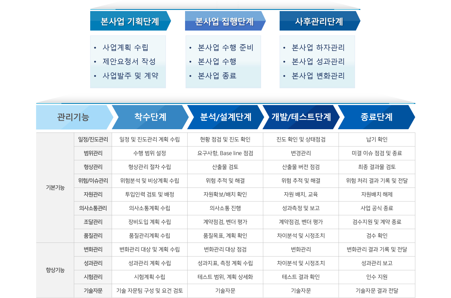 ¼öÇàÇÏ´Â ¾÷¹«·Î º»»ç¾÷ ±âȹ´Ü°è, º»»ç¾÷ ÁýÇà´Ü°è ¹× º»»ç¾÷ »çÈİü¸®´Ü°è·Î ±¸¼ºµË´Ï´Ù.